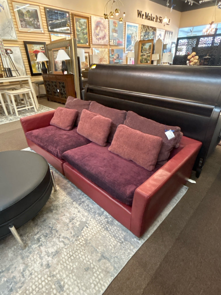 (AS IS) Dark Red Leather Sofa W/ Burgundy Upholstery