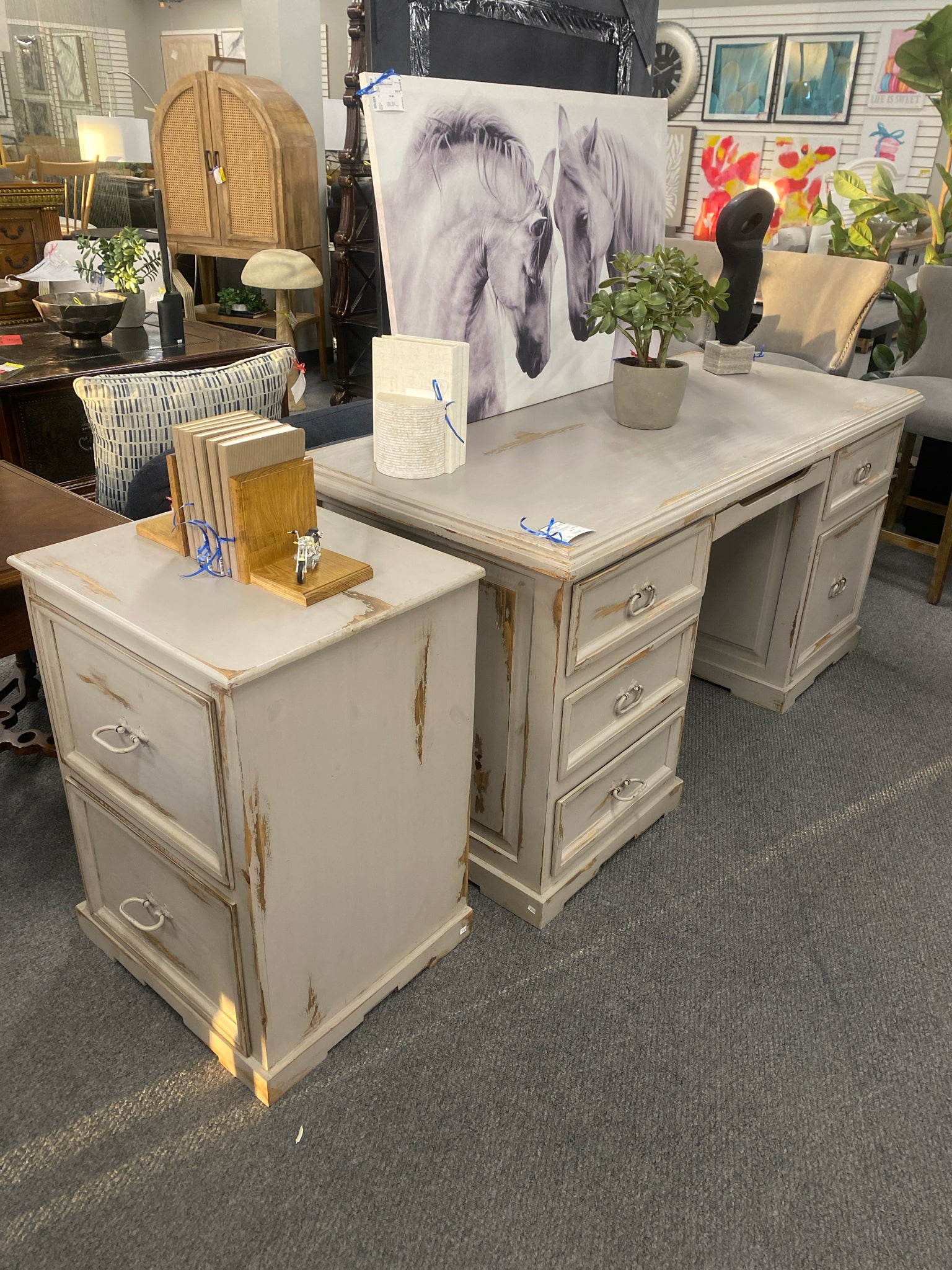 Distressed Finish 67x30 Desk w Matching 2 Drawer Filing Cabinet
