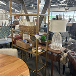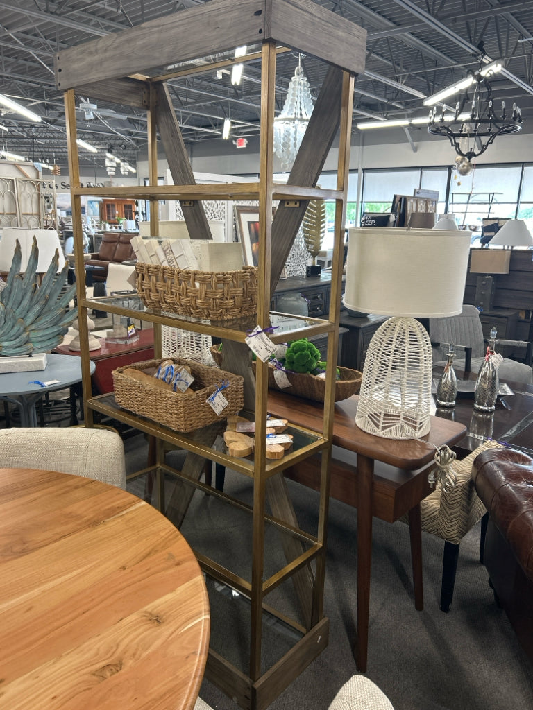 *** Jordrock Wood and gold metal 80" bookcase w glass shelves