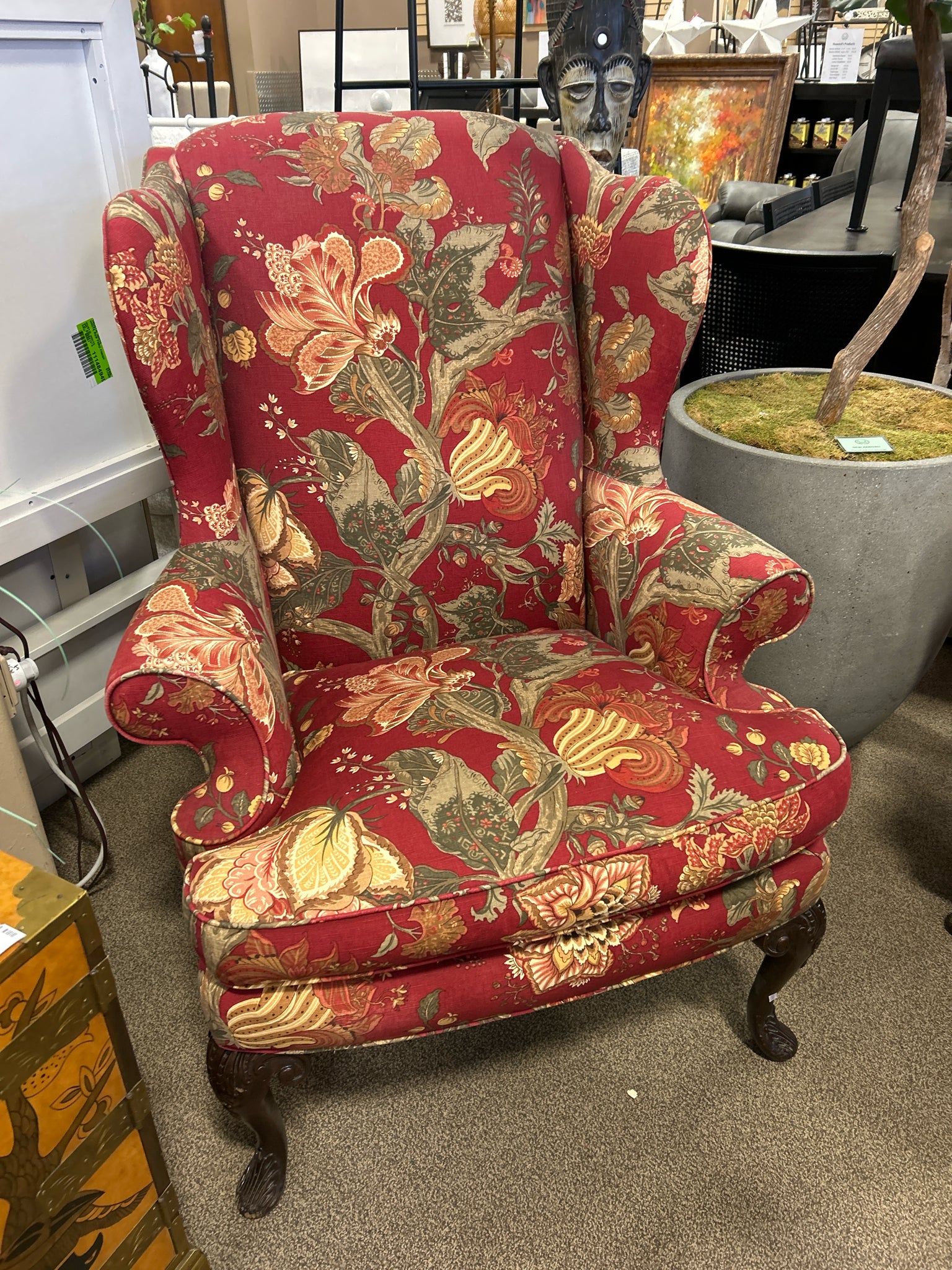 QUEEN ANNE UPHOLSTERED FLOWER PRINT WINGBACK CHAIR