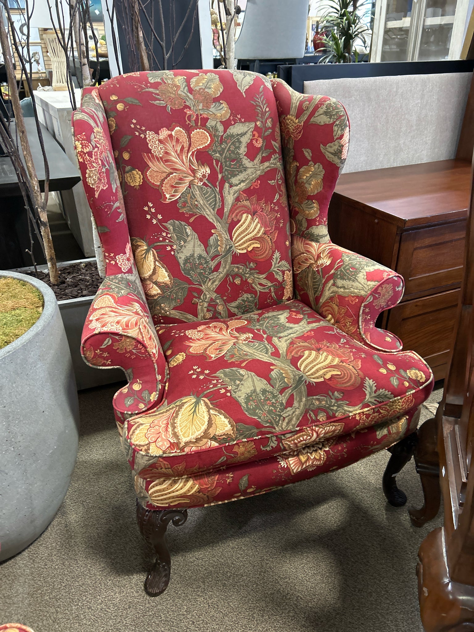 QUEEN ANNE UPHOLSTERED FLOWER PRINT WINGBACK CHAIR