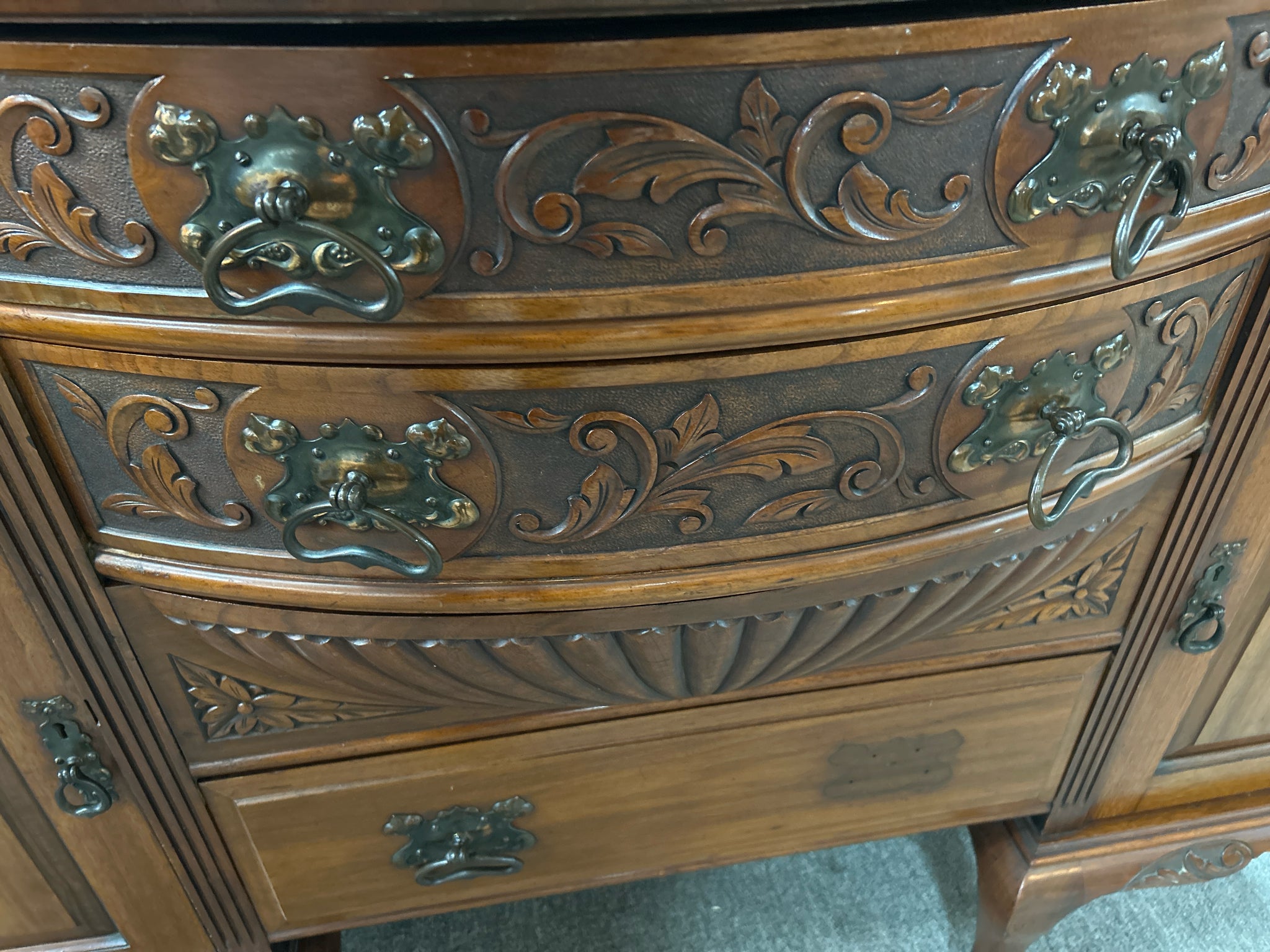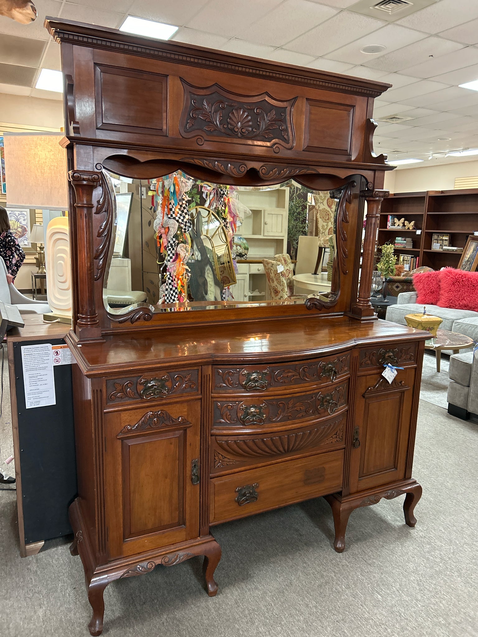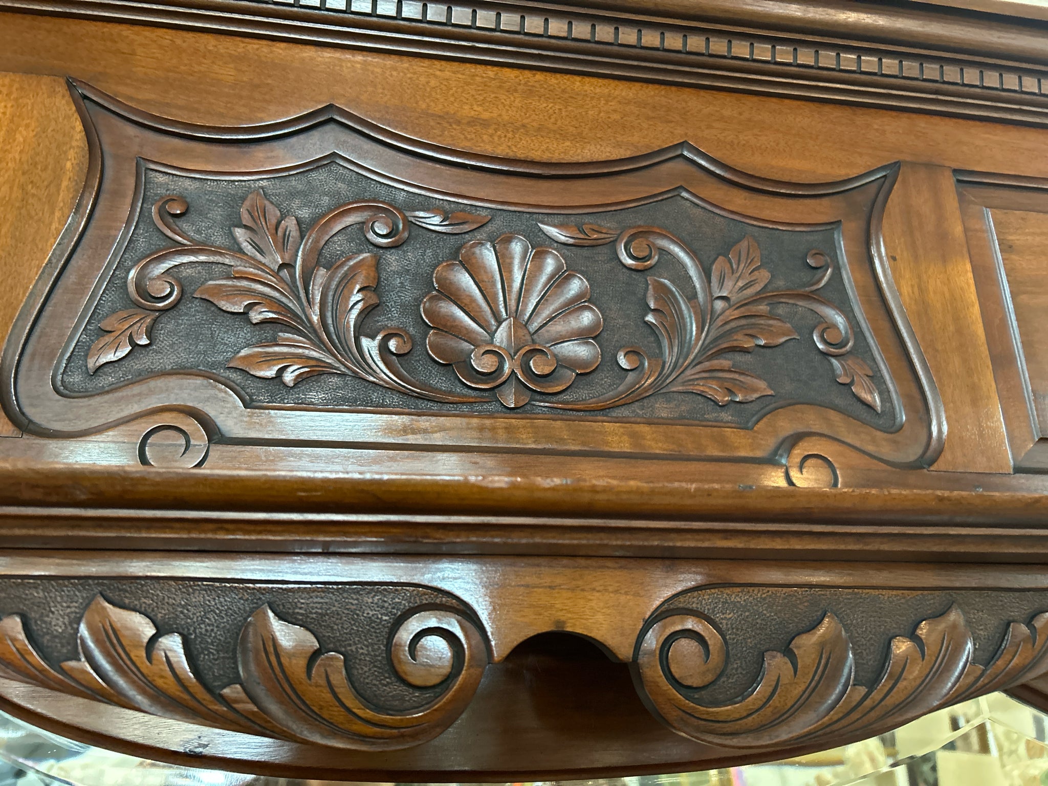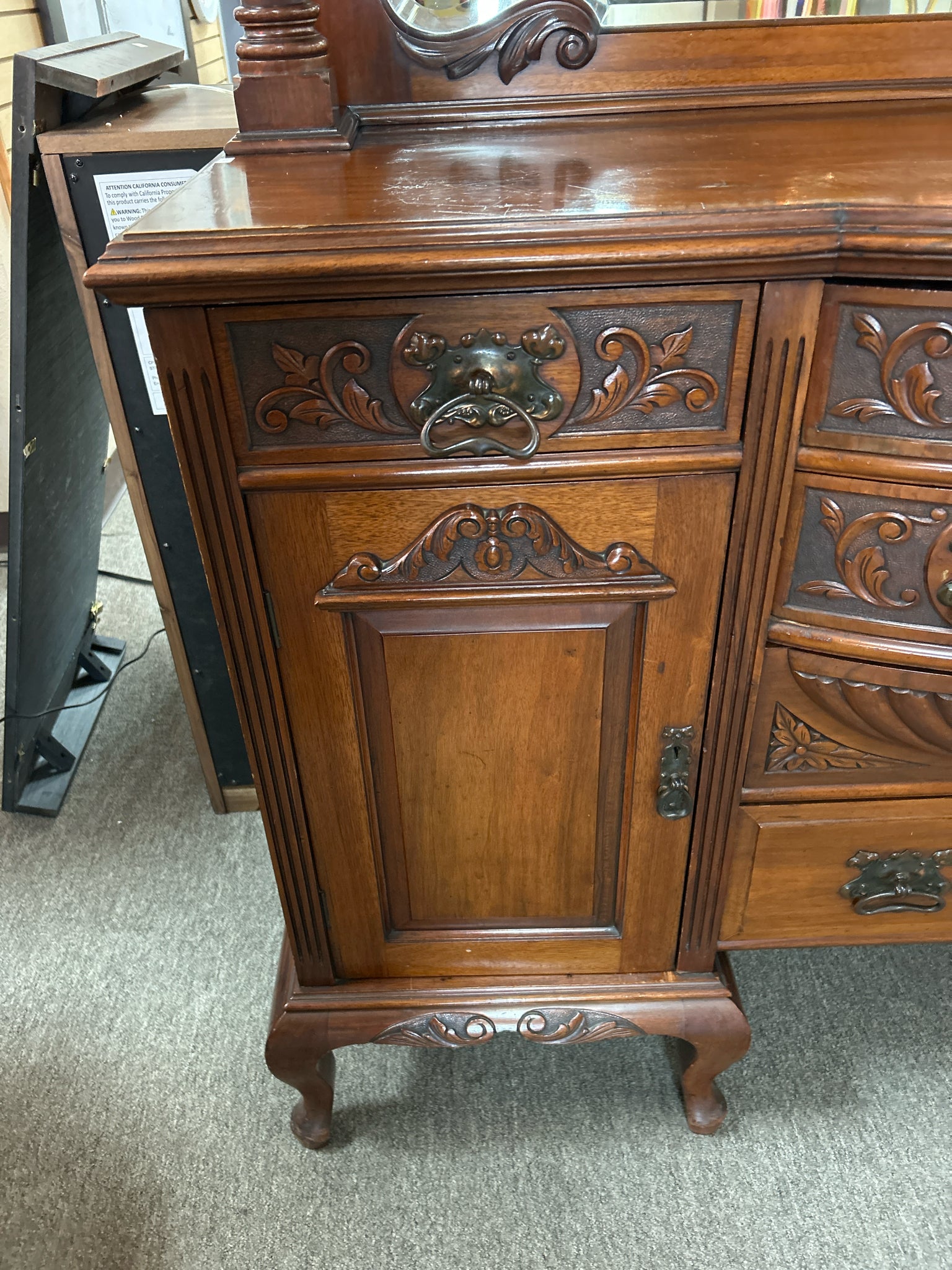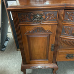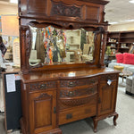 Antique Sideboard w/Mirrored Hutch & Floral Carvings, 4 Drawers, 2 Doors - 60x21x82"h (Missing Handle in Drawer)