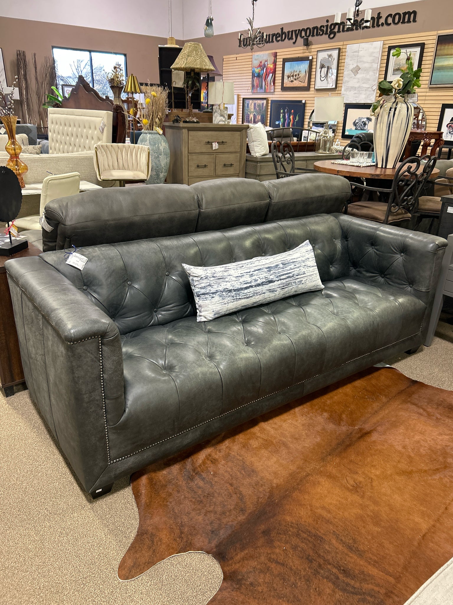 DISTRESSED GREY TOP GRAIN LEATHER BUTTON TUFTED 90"L SOFA W/SILVER NAILHEAD TRIM