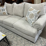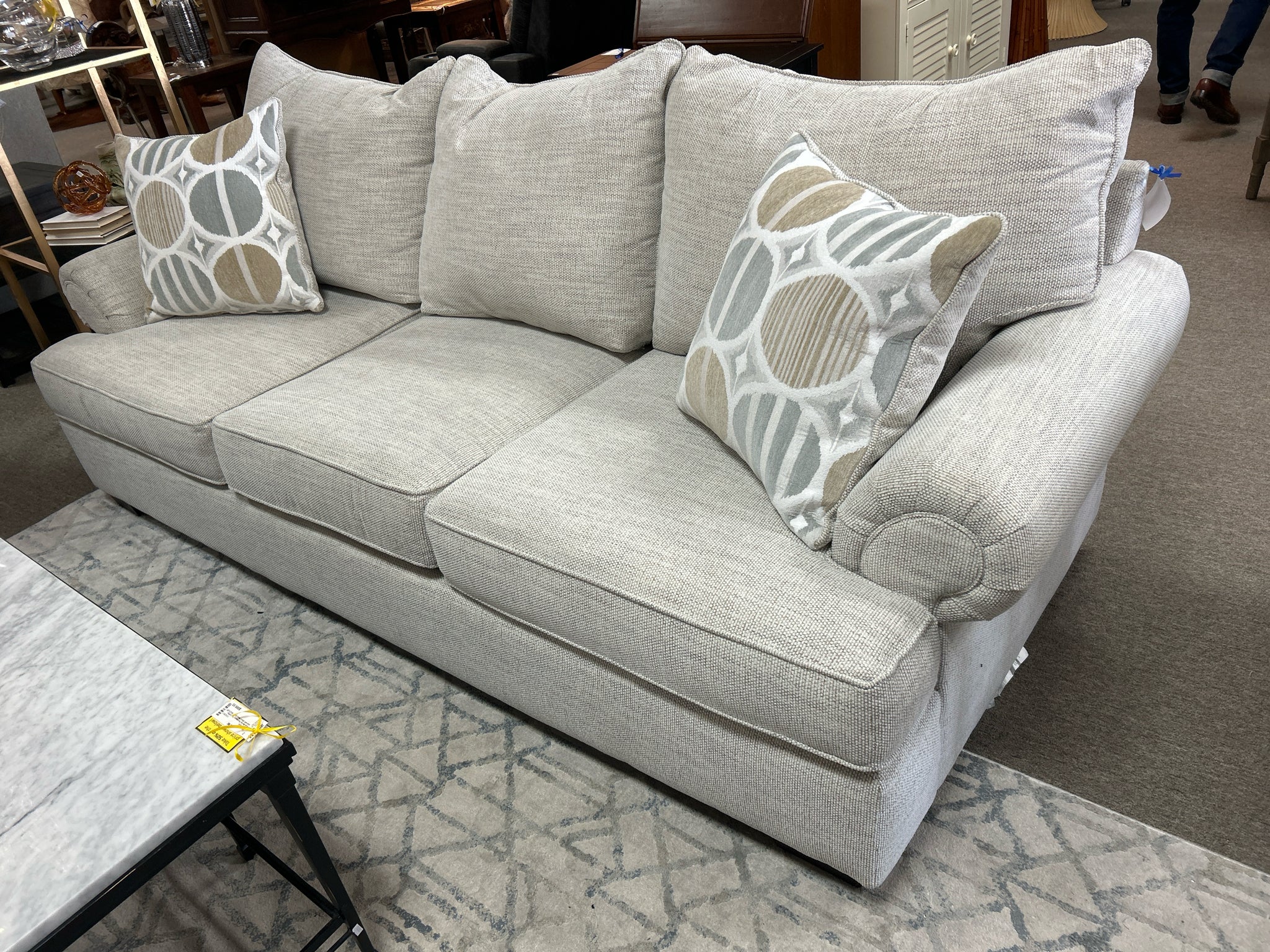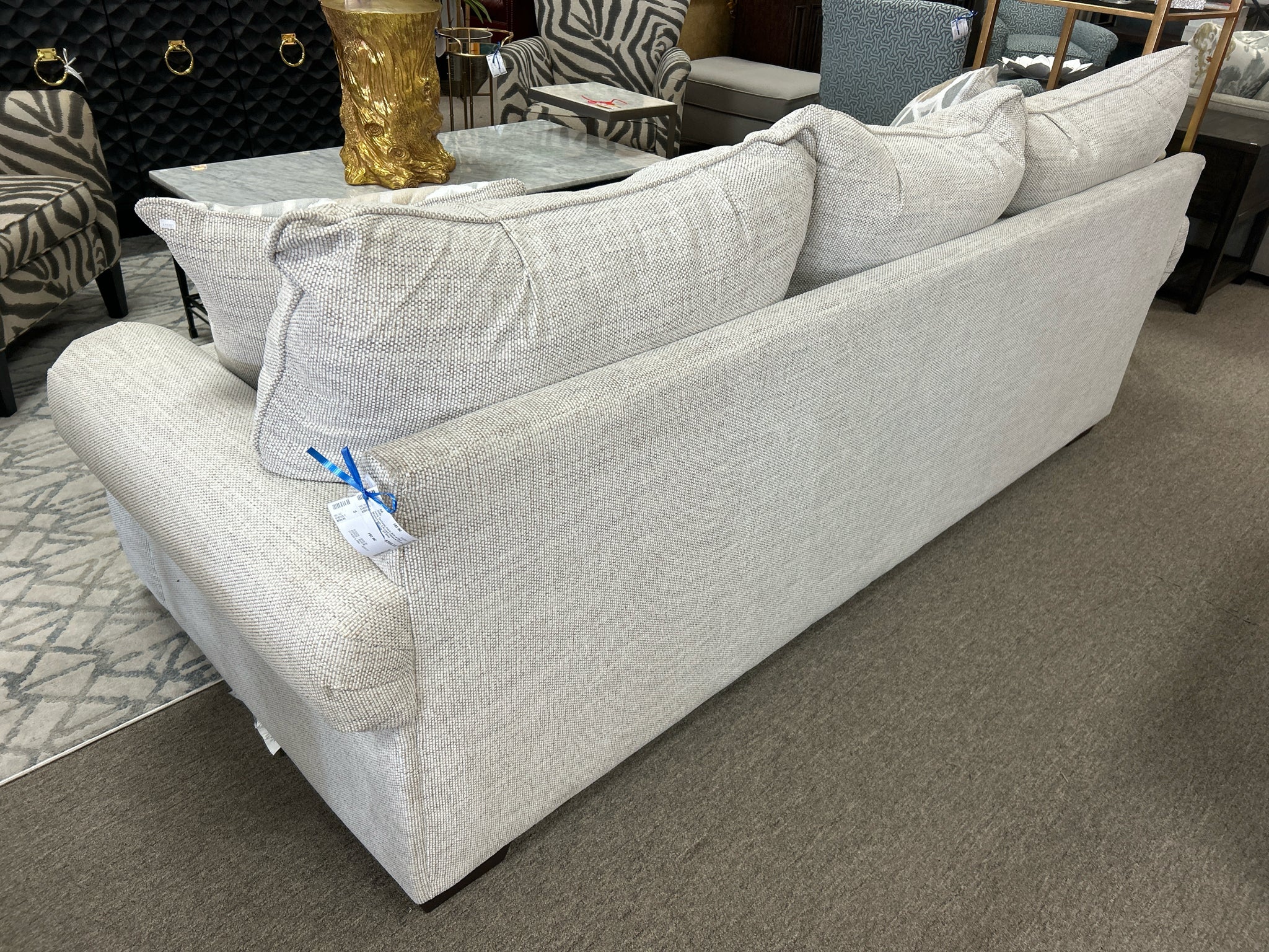 Ivory Textured Fabric Sofa w/ Dark Wood Legs, 2 Accent Pillows w/ Circles Pattern. 8ft long, 3'3"deep