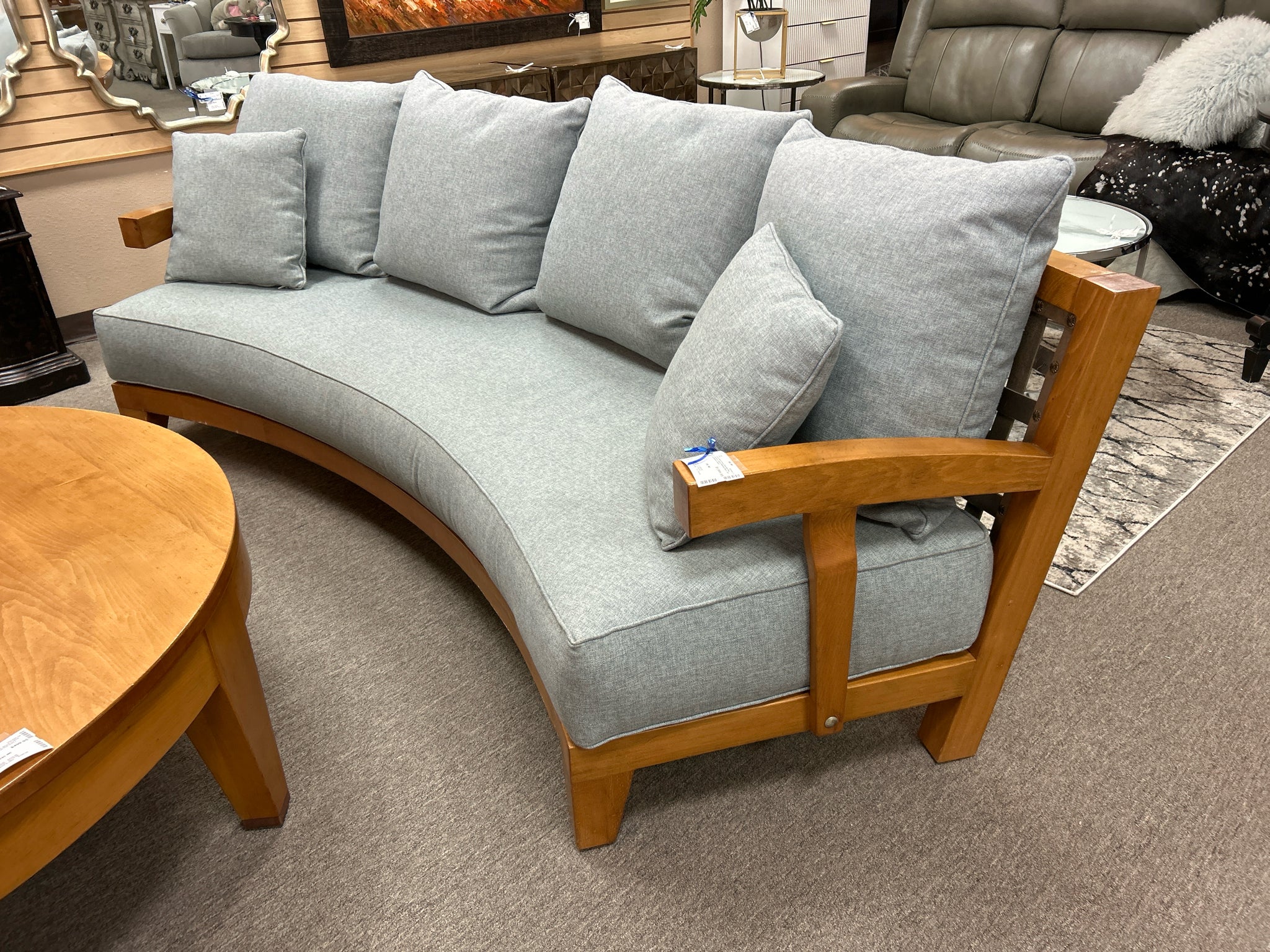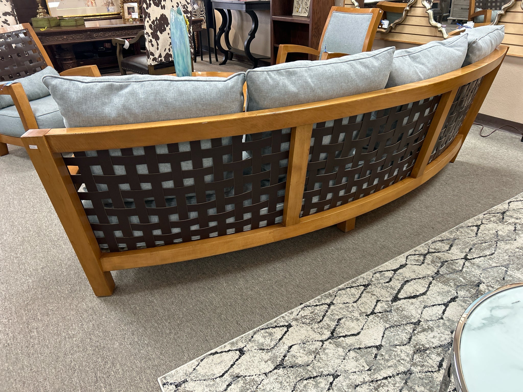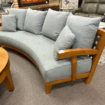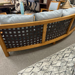 Curved Wood Frame Sofa with Blue Cushions, Leather Webbing Back. 96". Purchased in Spain.