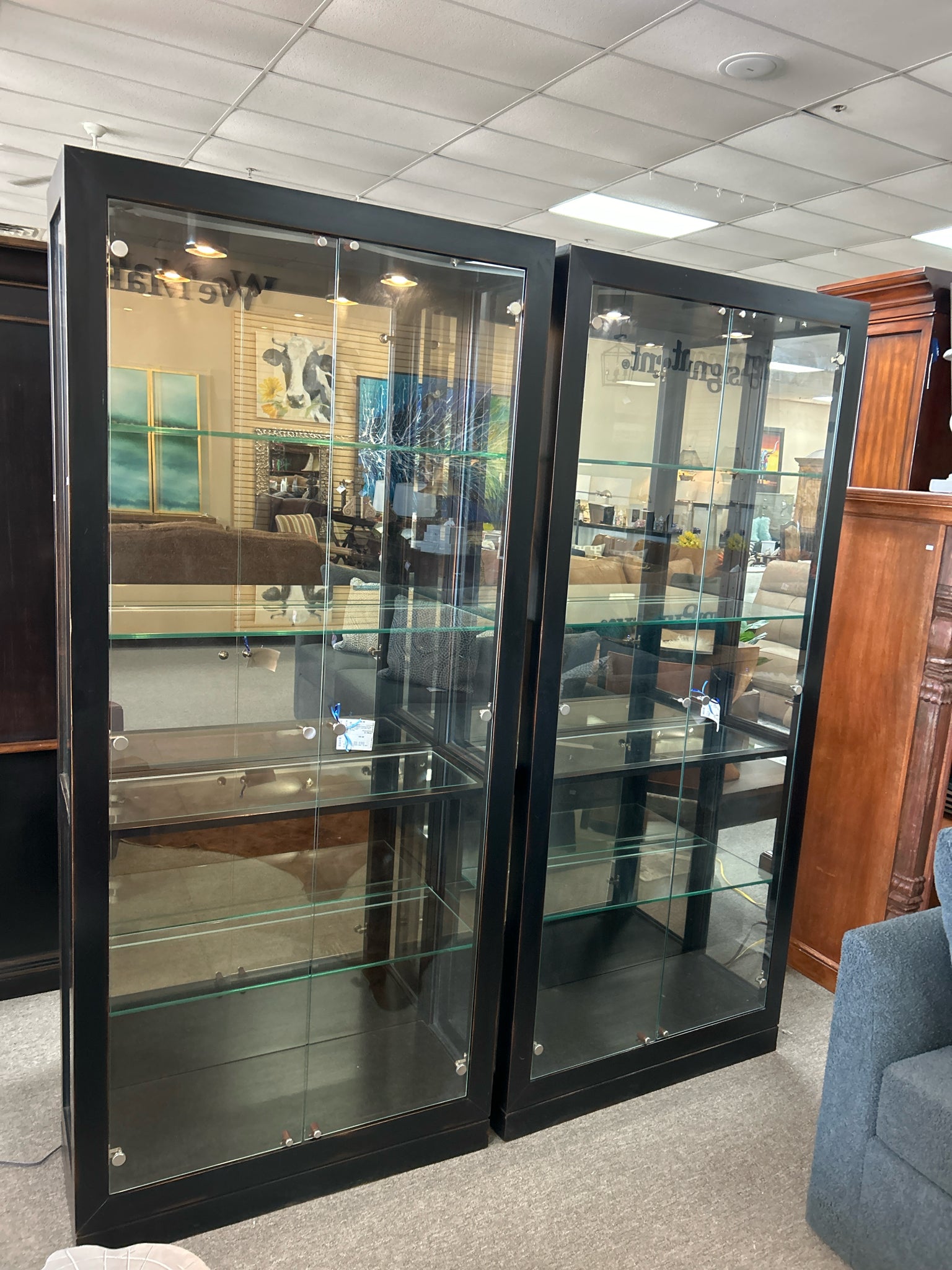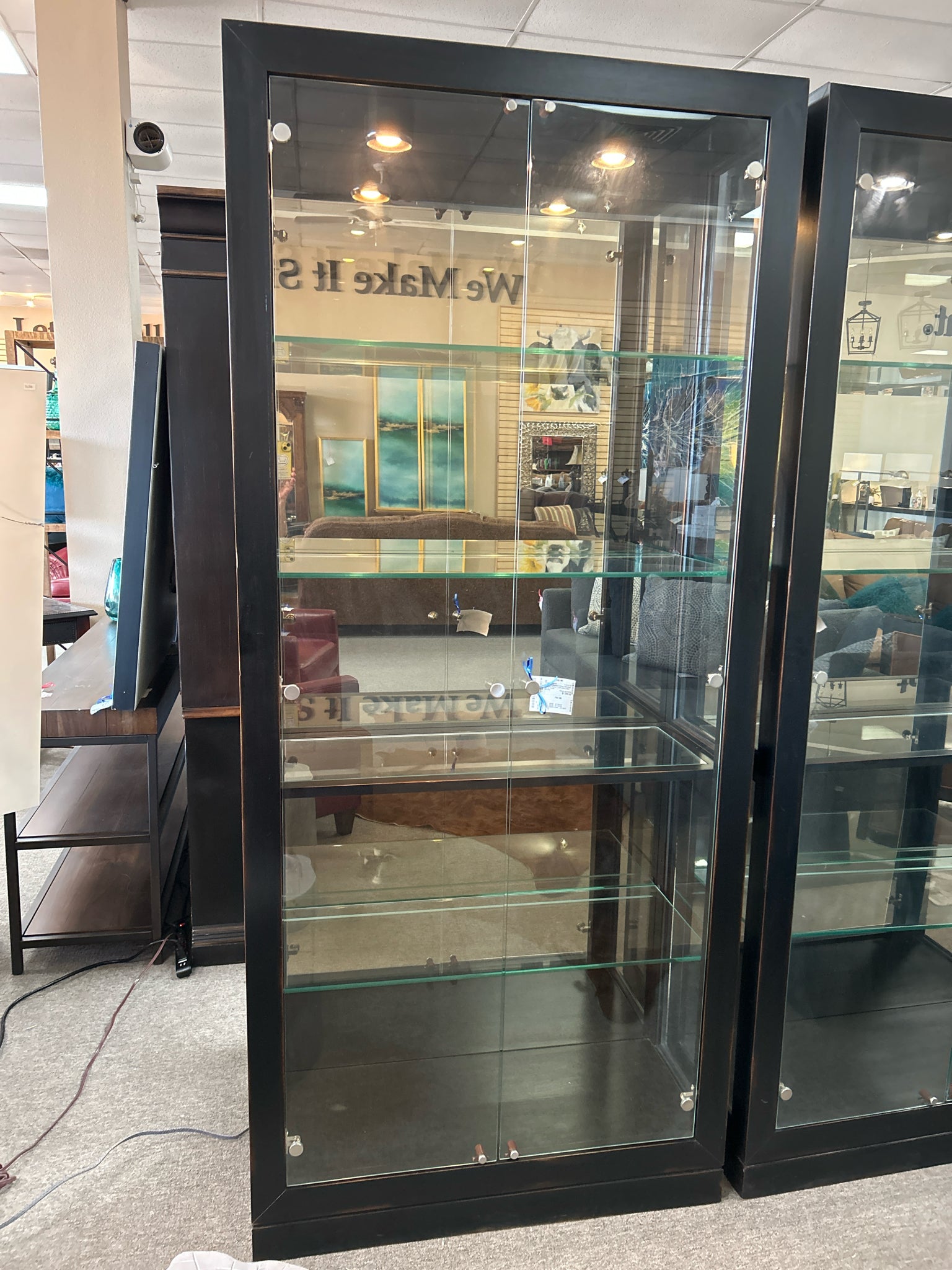 Dark Oak Display Cabinet with 4 Glass Shelves, Interior Lights,Mirror Back. 32x14 1/2x81".