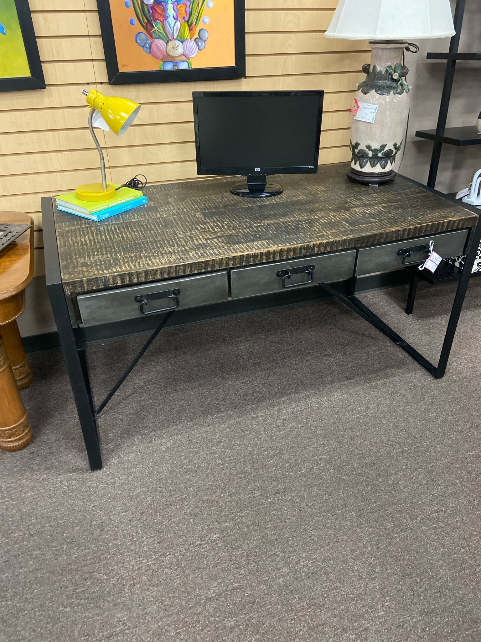 28053 Industrial metal and wood 3 drawer desk