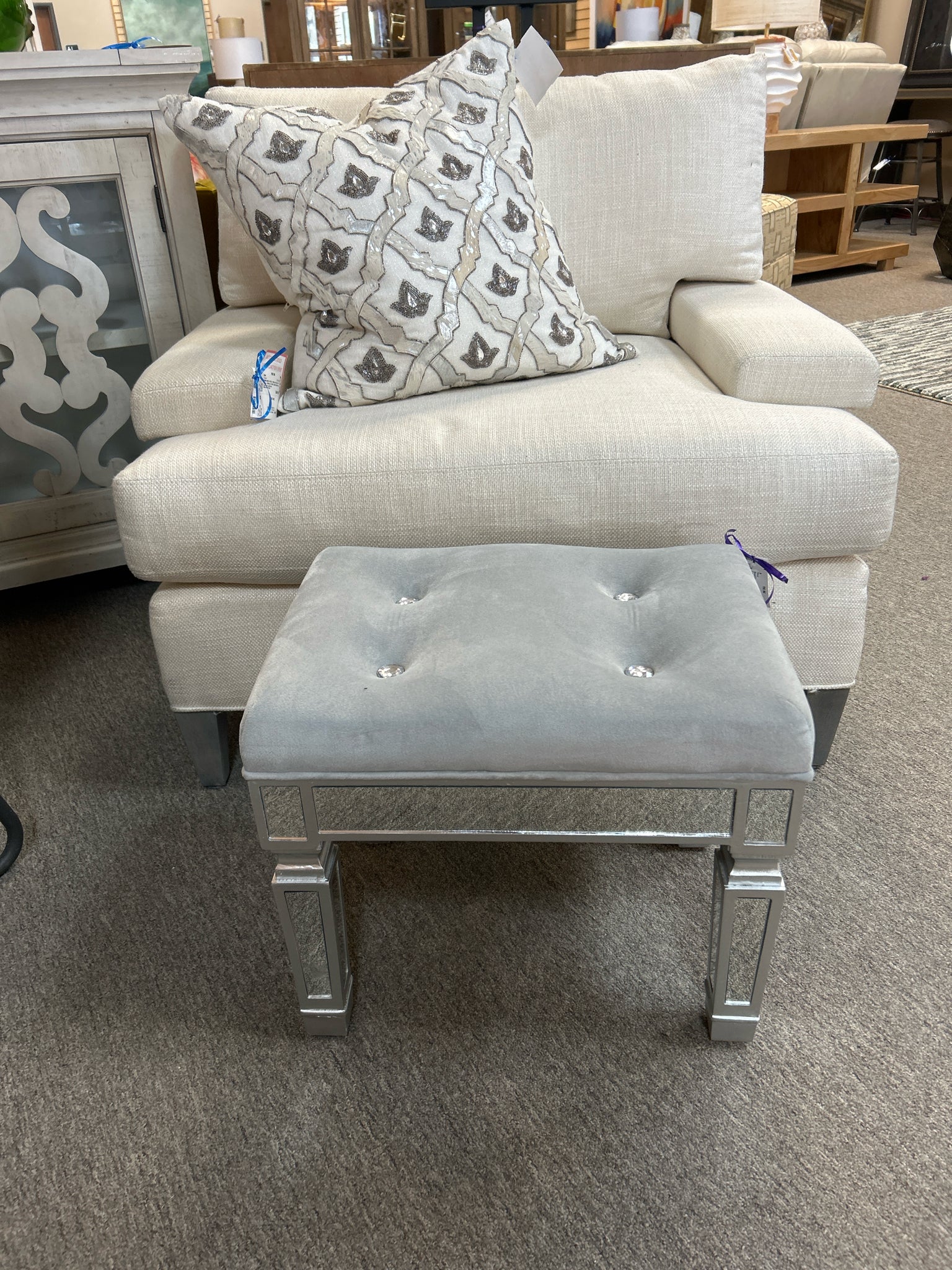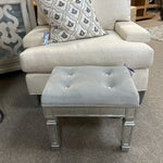 Small Grey Velvet Top Stool with Crystal Buttons/Mirrored Legs. 19x14x17"
