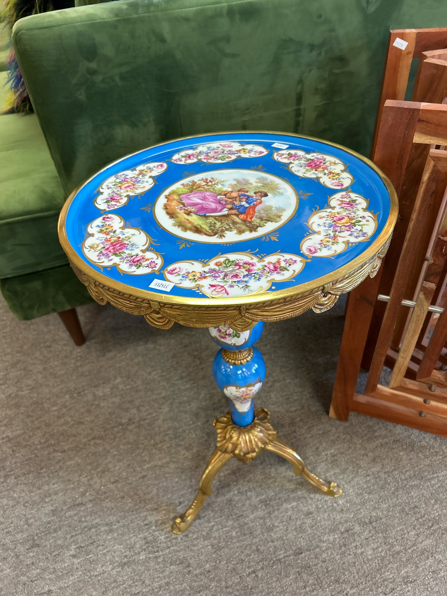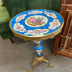Bright Blue 15" Round French Style Accent Table with Bronze Tripod Base. Romantic Couple Painted Top. 23" tall.