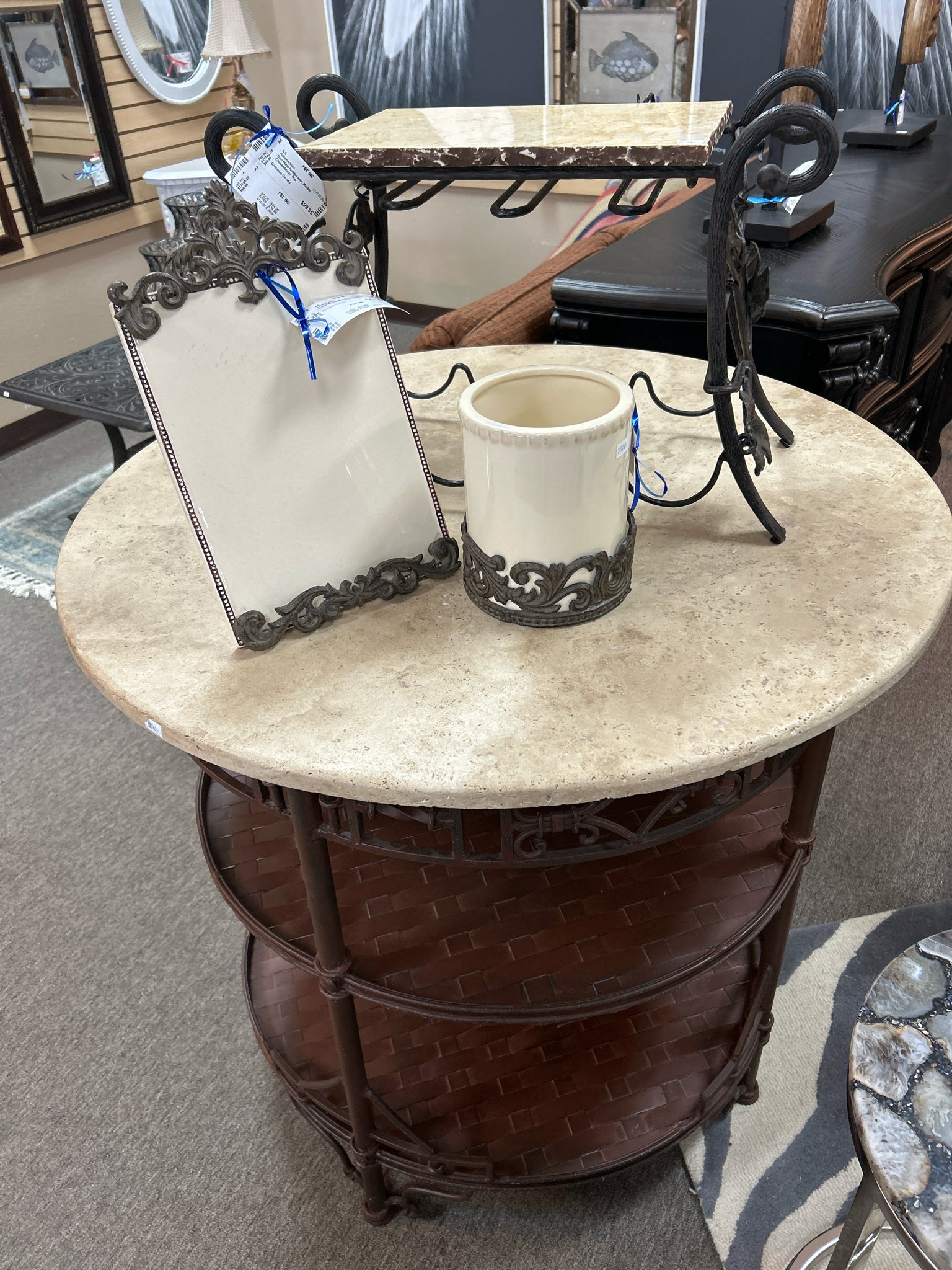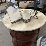 36" Round Cream Marble Top 2 Lattice Design Shelves Iron Base Accent Table