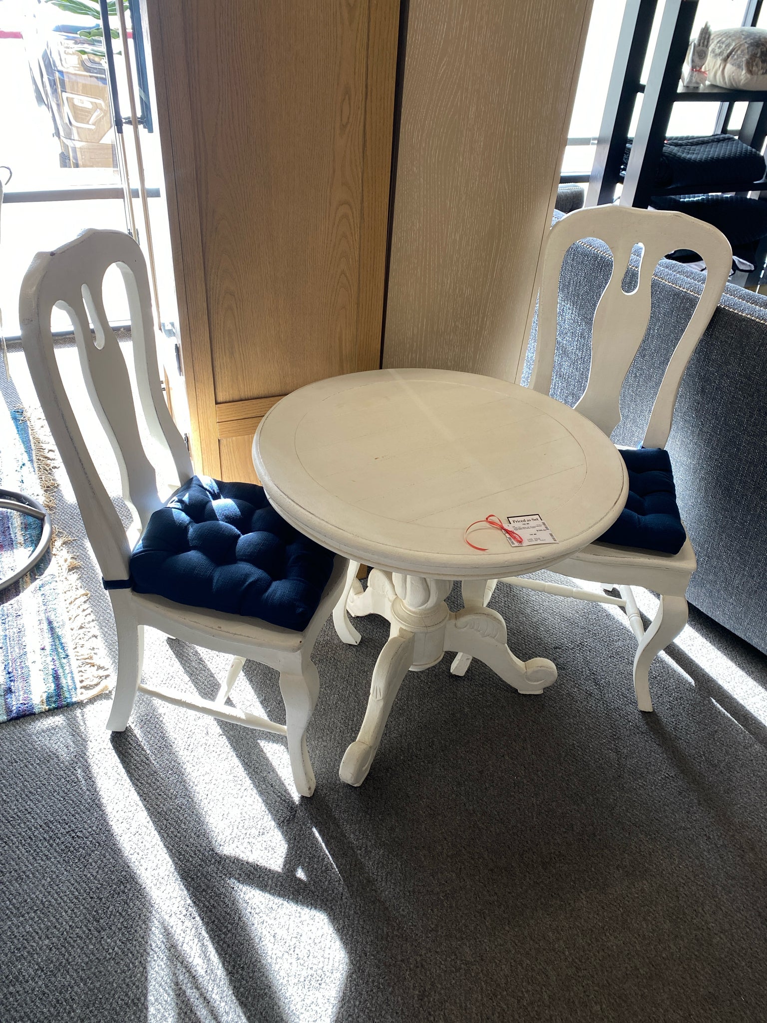 Distressed White 30" Round Pedestal Table With Pair White Chairs