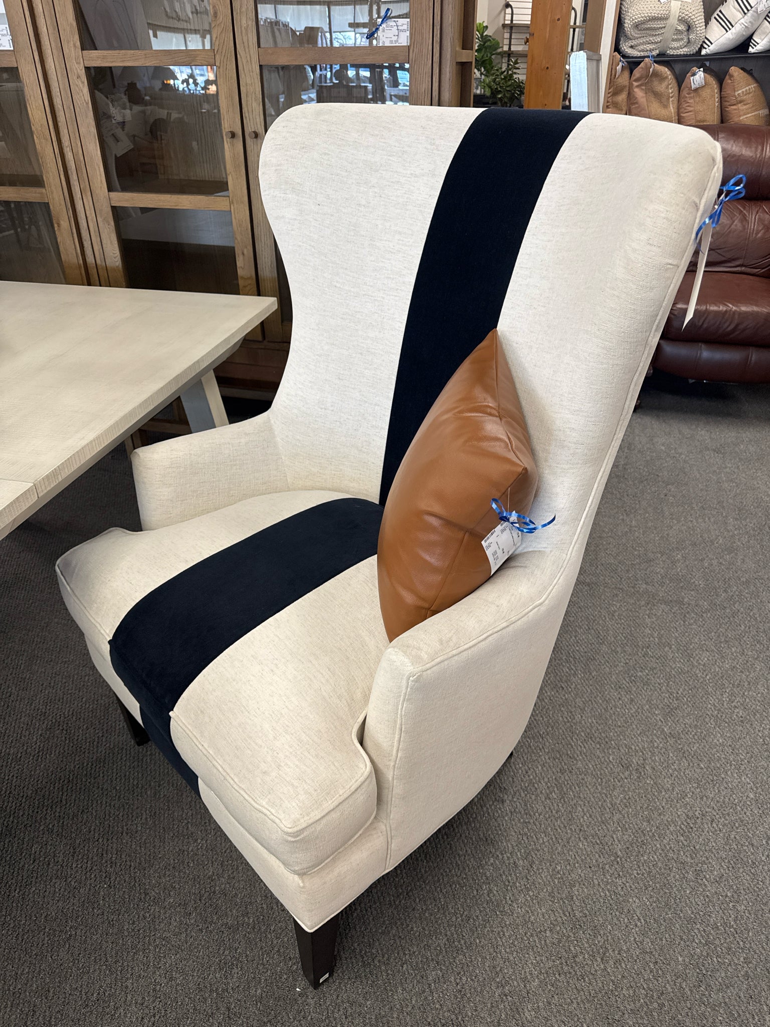 Surfside Performance Fabric Wing Chair w Vertical Navy Stripe