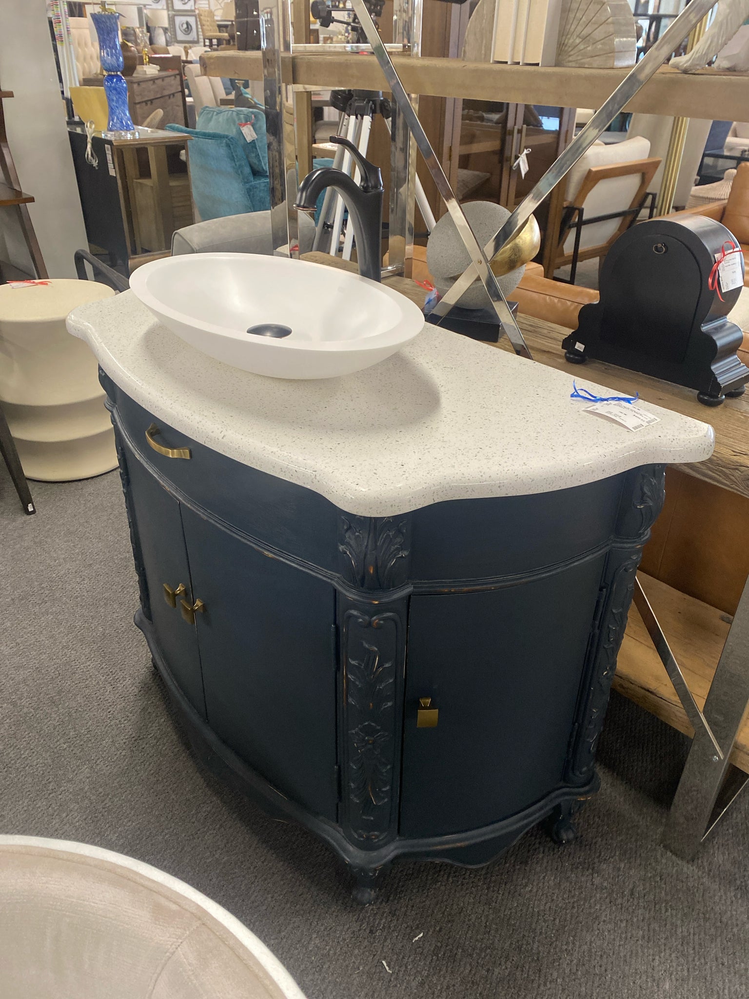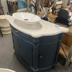 Custom Blue 46" Vanity w Gold Hardware, Quartz Top, White Sink, and Black Faucet