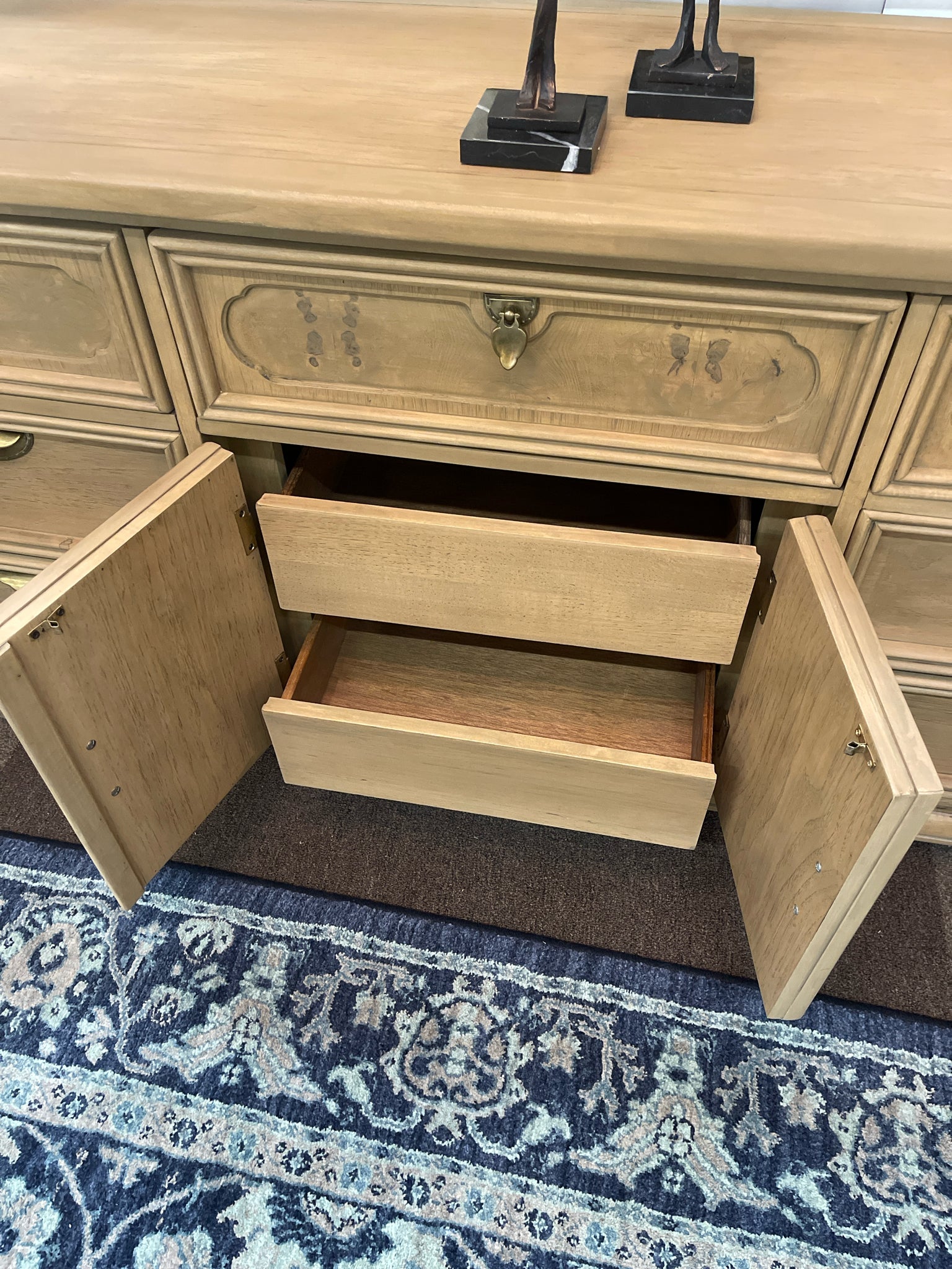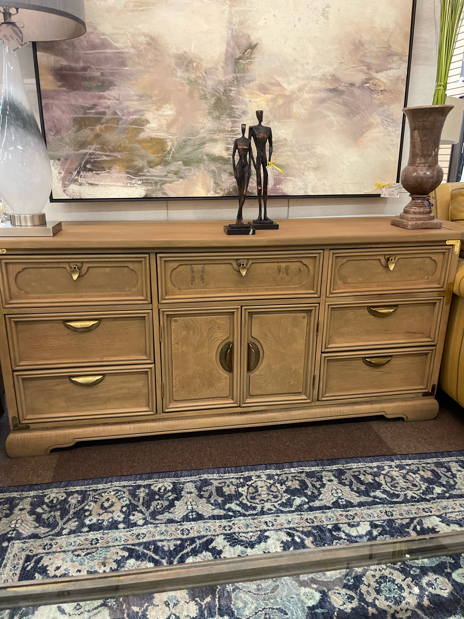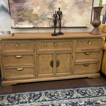 Vintage 1970's Natural Finish w/Burlwood 7 Drawers, 2 Doors w/Aged Brass Hardware 70"W 19"D 31"H