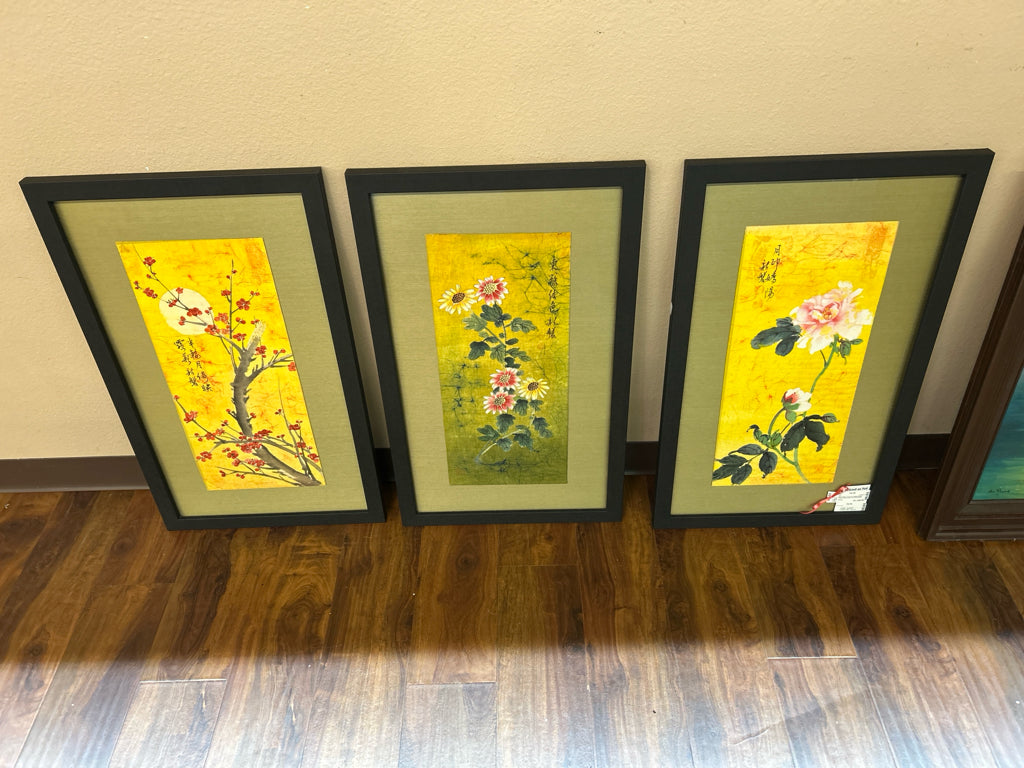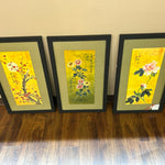 SET/3 Black Framed Original Bright Yellow Floral Asian Scroll Paintings