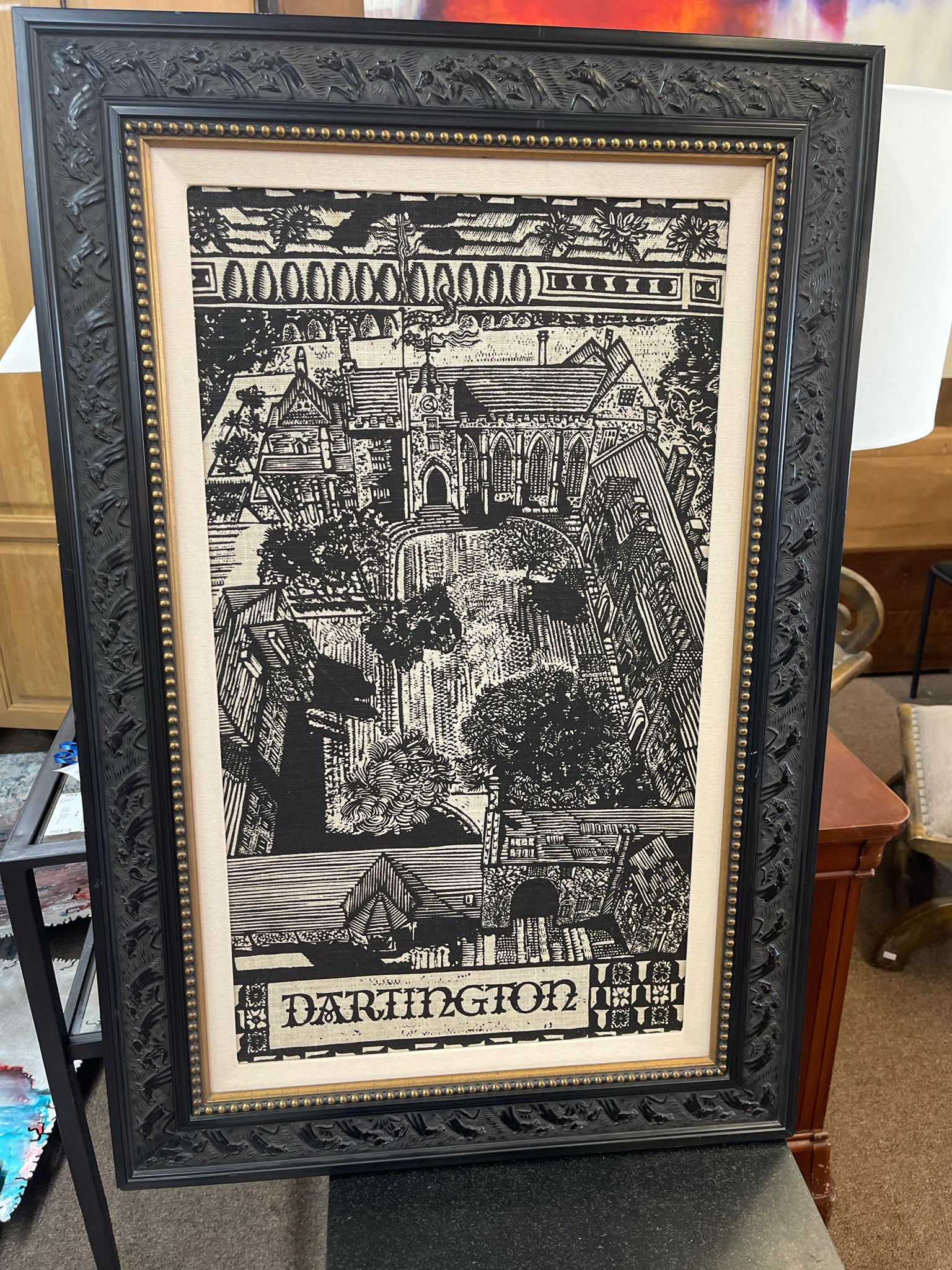 Black & White Linen Print of Dartington Hall in Devon, England Framed in Black & Gold
